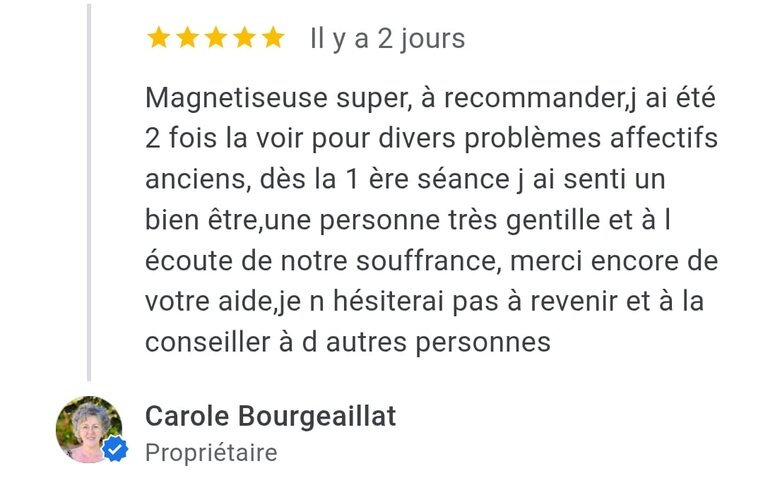 Étant d'un naturel anxieuse, pessimiste, pas confiance en moi et stressée. je peux dire à l'heure d'aujourd'hui qu'avec le temps passé près d'elle j'ai pu me sentir différente et surtout savoir appréhender les choses parfois difficile de la vie avec beaucoup plus de sérénité. à apprendre à prendre du recul par rapport aux agressions diverses. tout cela est un grand pas pour moi. alors n'hésitez plus prenez rendez vous avec Carole elle vous redonnera le gout de vivre grâce à ce don inexplicable mais aussi grâce à vous qui déciderez enfin de prendre votre destin en main en prenant le temps d'évaluer vos problèmes quel-qu’ils soient, de les analyser et de vous protéger à travers les séances. C'est vous seul qui décidez du nombre de séances que vous avez besoin.